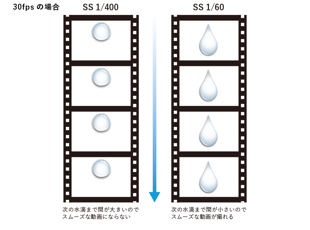 例えば、30fpsで撮影する場合の適性シャッタースピードは、1/30(秒)か1/60(秒)です。