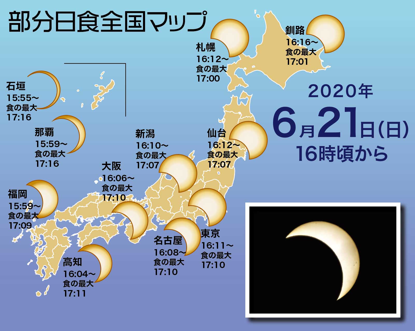 6月21日(日)の16時頃から日本全国で部分日食を観測することができます。
