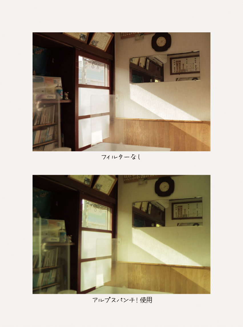 アルプスパンチ!、なついろパンチ!は、肉眼で見ている世界とは別の世界を作る、記憶の中にある心の画像を写す、そんなコンセプトのもと、マルミ独自のソフトフィルターを2枚使用し、解像度を大胆に落とした、強い滲みと優しい描写と、個性的な色表現が特徴の製品です。