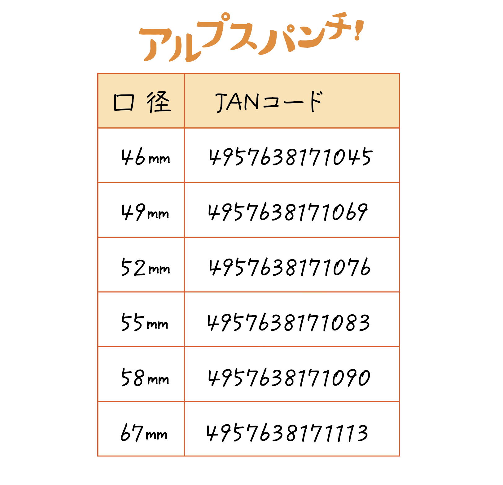 46ミリ、49ミリ、52ミリ、55ミリ、58ミリ、67ミリの6サイズをご用意しました。